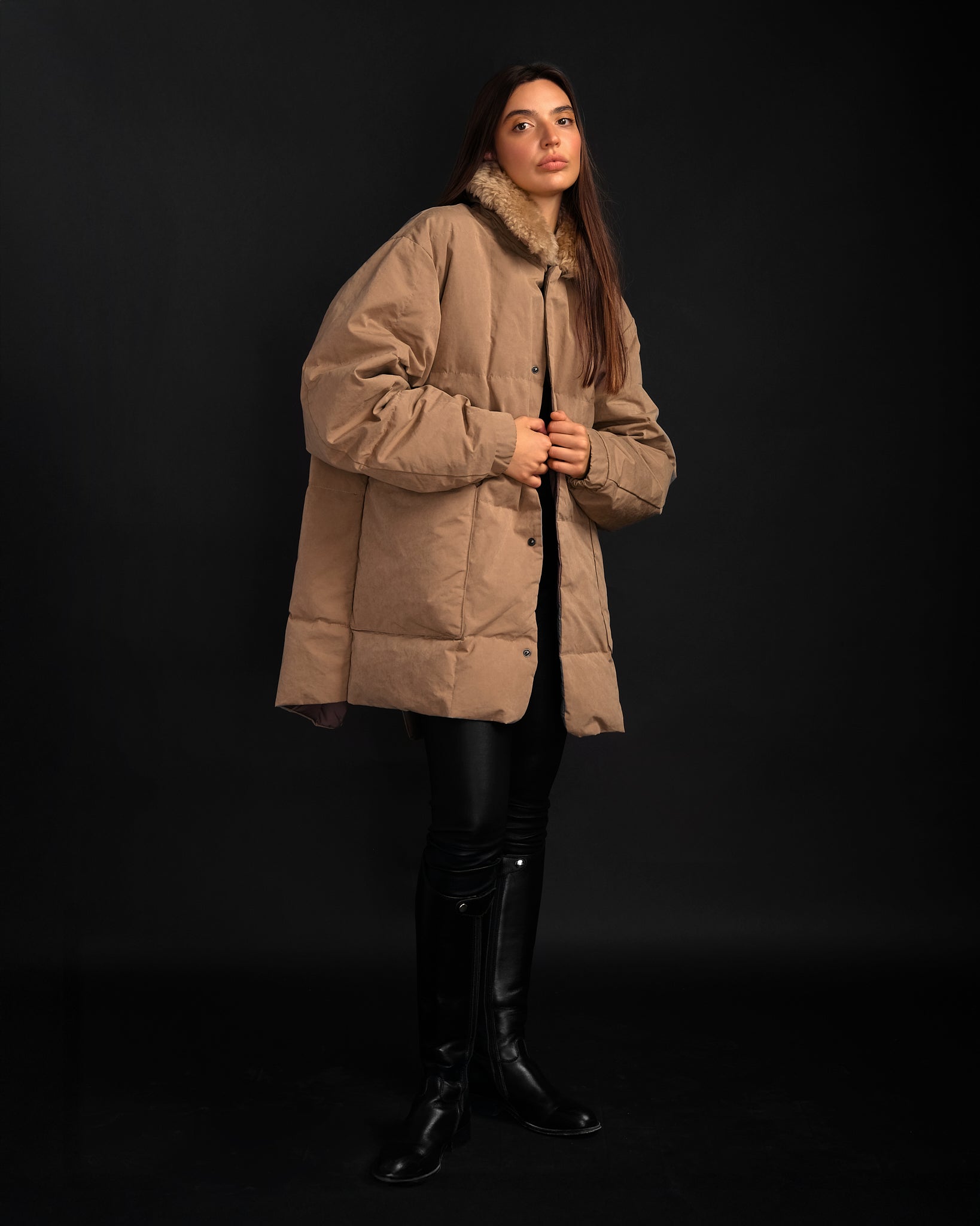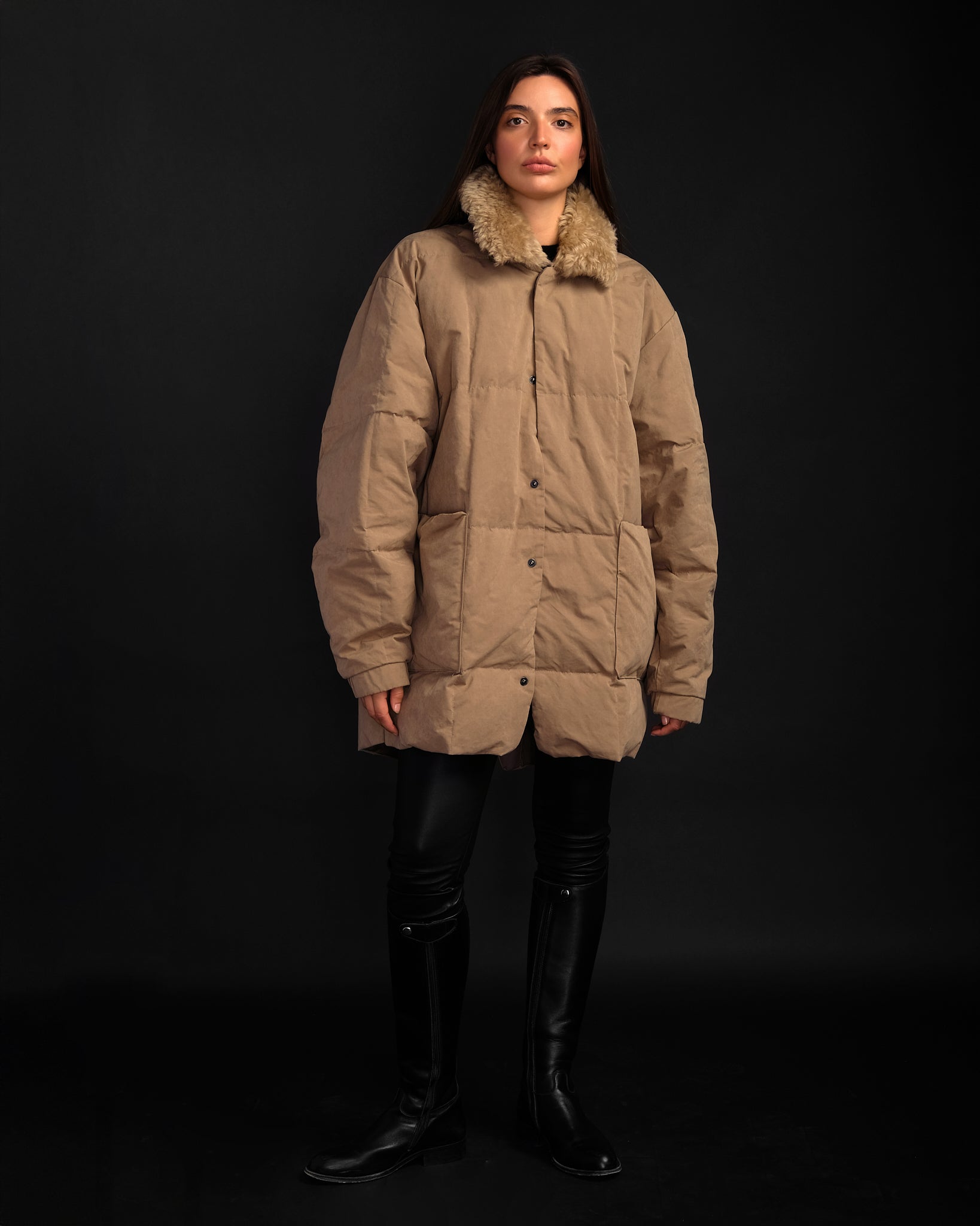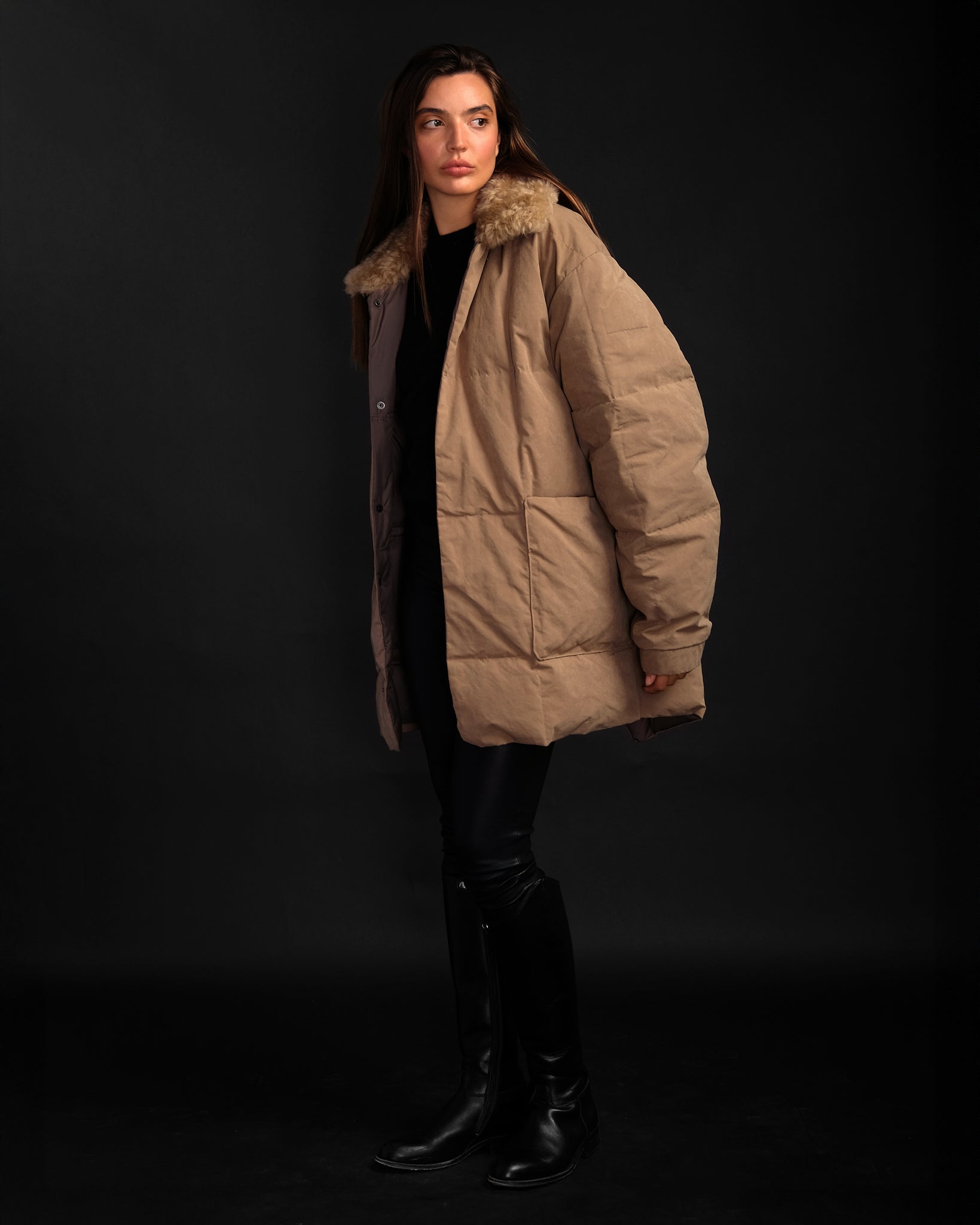 地球上で最も軽い、持続可能な方法で採取されたカナダ産アイダーダウン 100% で軽く断熱され、ニュージーランド産の本物のシープスキンの首輪で仕上げられています。