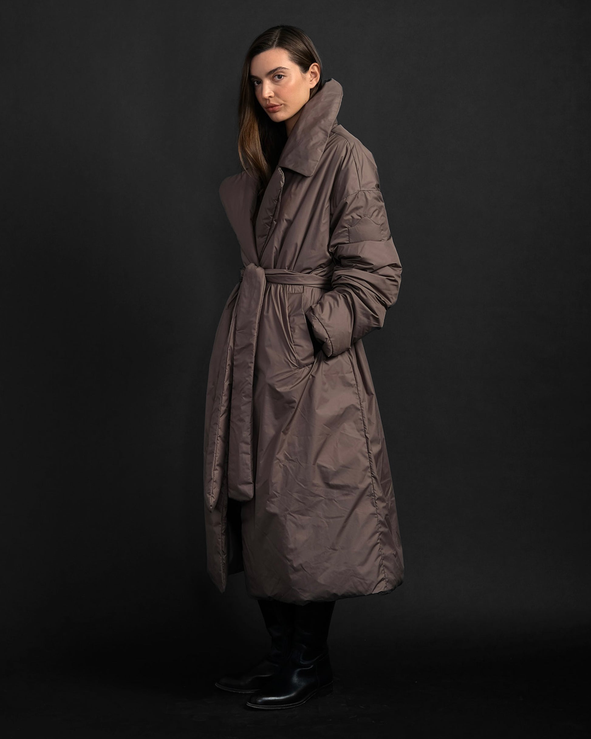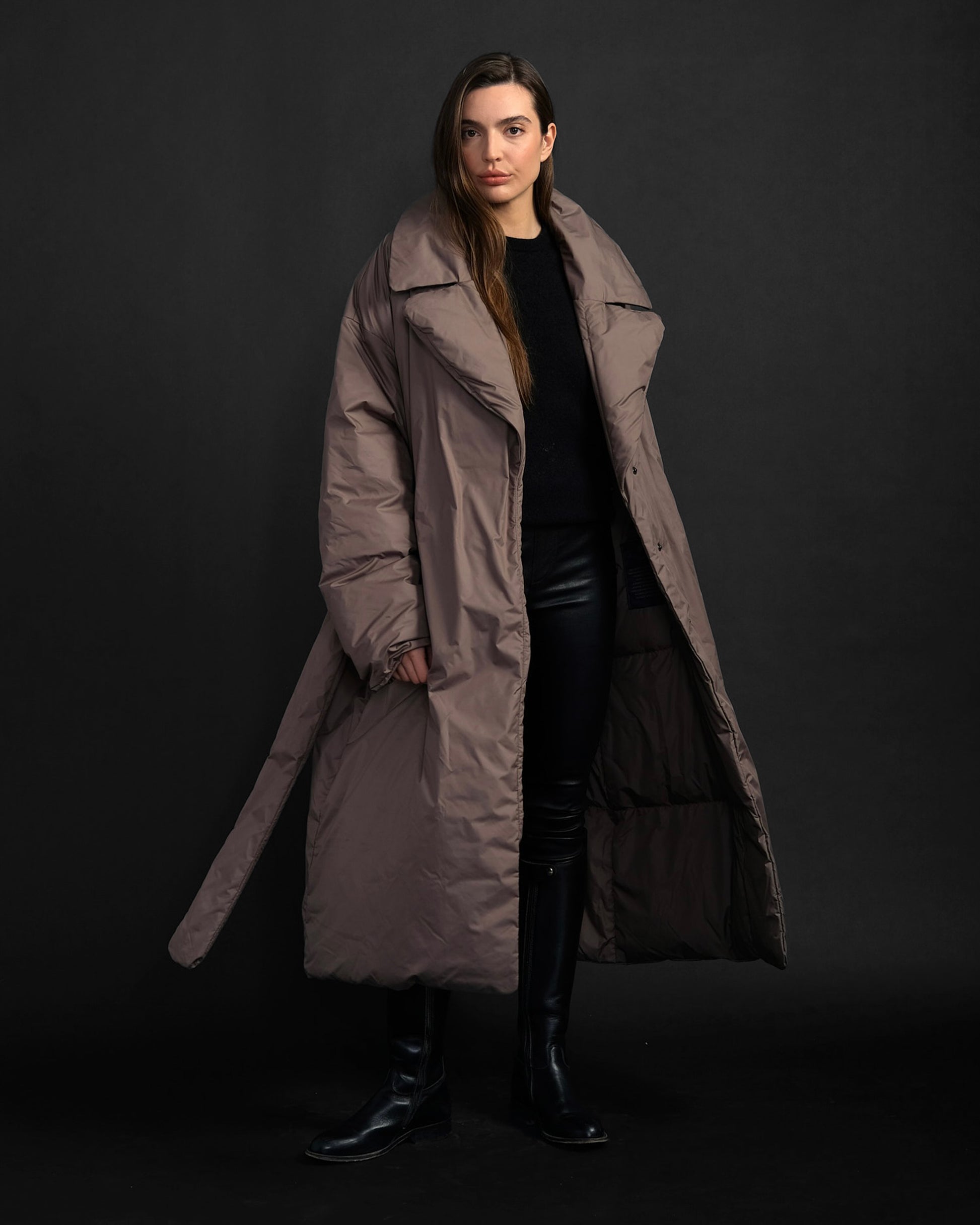 Belted or oversized, The Duster is a weightless, totally cozy, and compressible sidekick worthy of any fabulous trip. Wear it over a little dress or tucked under your chin on a long plane ride. Bring on the night. It is insulated with the lightest down on earth—made of our ultra-light Matte recycled Nylon.