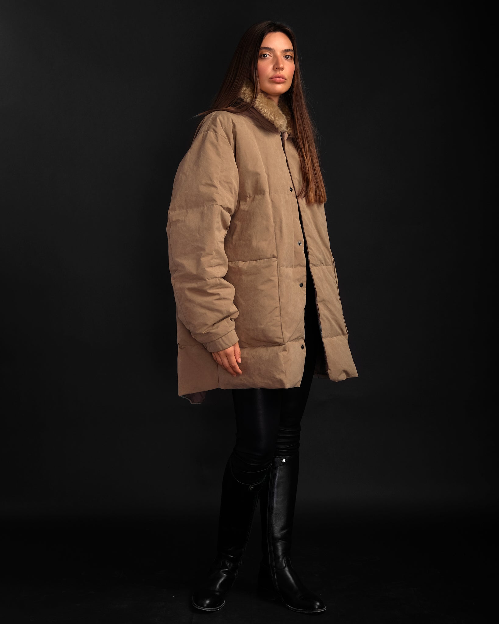 A soft upgrade with serious warmth. The Shearling Collar transforms any collared or collarless Olmsted piece into a statement of comfort and character. Made from genuine mouton sheepskin, available in three natural shades—light, mid, and dark—this removable collar attaches with hidden snaps and can be self-mounted or added to your order. Pairs seamlessly with The Quilt and The Lining, or used to elevate any collarless silhouette in your Olmsted wardrobe.